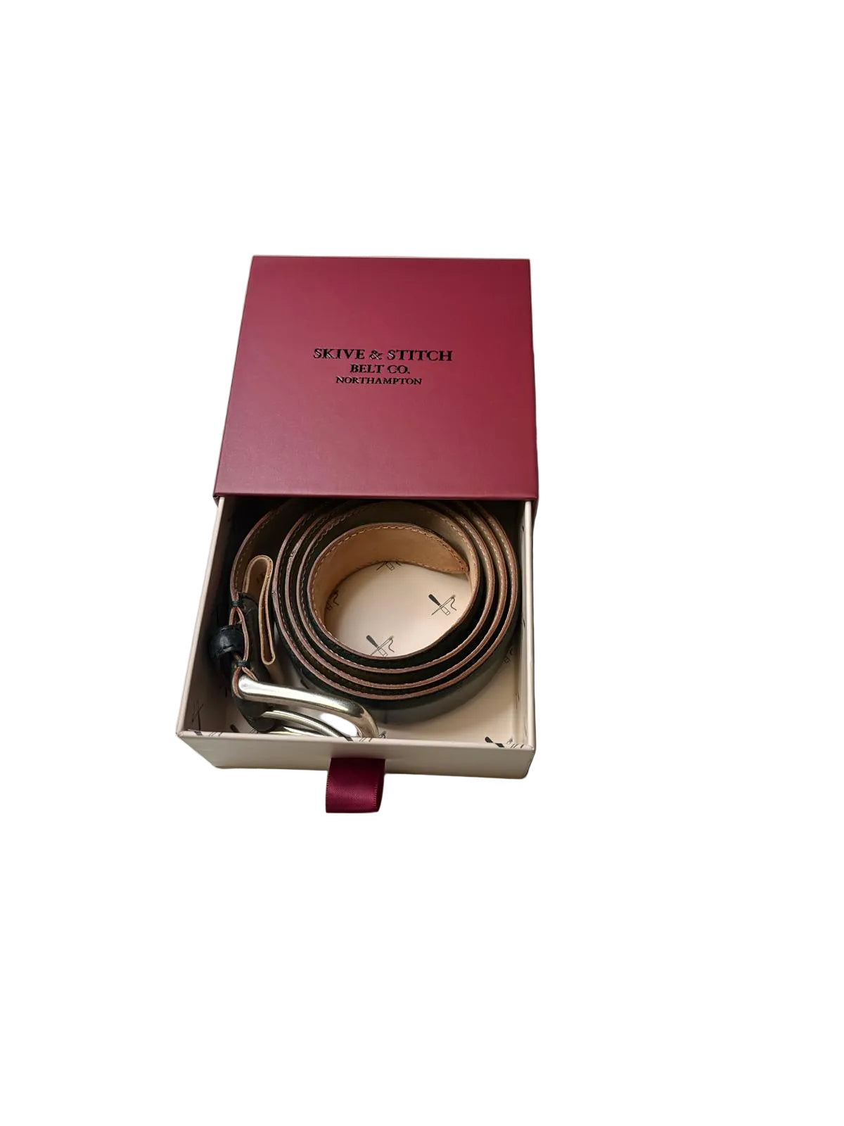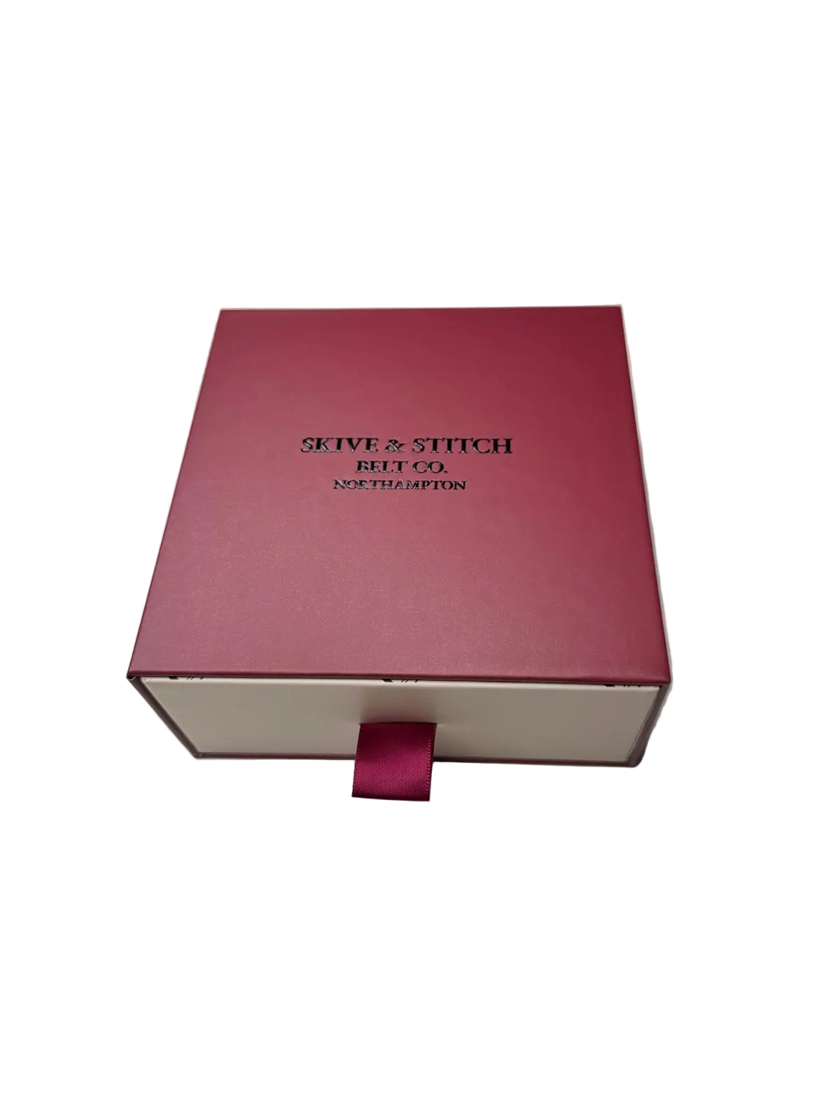 Every Skive & Stitch belt is finished and presented with intent. Each piece is housed in our branded box, designed to protect the belt in transit and reflect the care, restraint, and standards of our Northampton workshop.